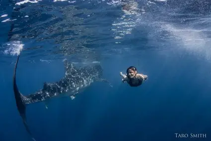 Fotograful și prietenul Shawn Heinrichs îl surprinde pe Taro filmându -l pe Amy în prezența unui rechin de balenă și a lui Manta Ray.